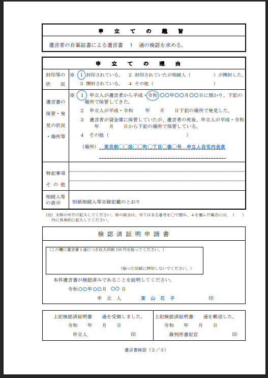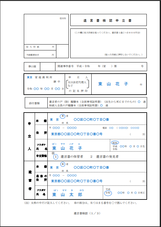 相続人の住所地を管轄する家庭裁判所に「遺言書検認申立書」を提出します。書式は裁判所HPからダウンロード可能です。 - 必要書類を添付