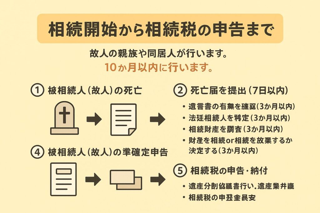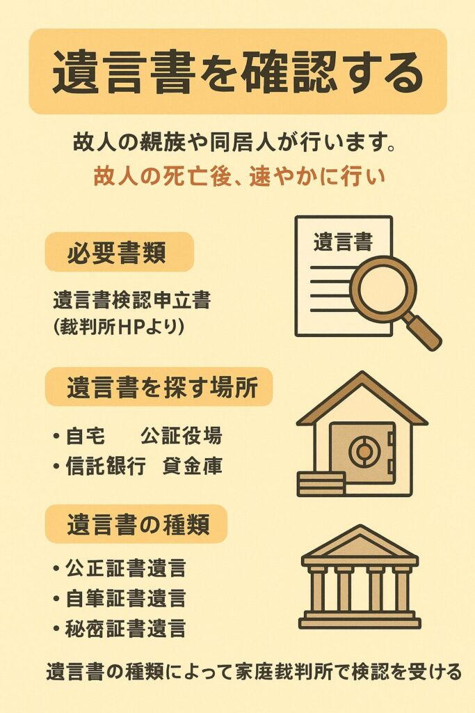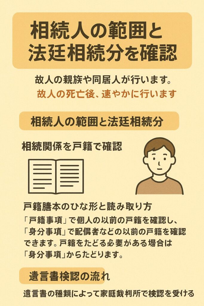- 遺言書の有無、相続人の確認、財産の調査・評価を順に行う